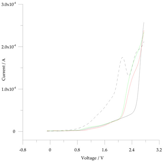 Anodic scan of HS-derivatives separately investigated in AN/0.05 M TBAP at the Pt-quartz crystal WE, Ag/Ag+ non-aqueous RE, Pt-wire AE, scan rate 50 mVs−1. Cbz-HS 1 mM (dashed line); Acetyl-HS 1 mM (solid line red) and Acetyl-HS 2 mM (solid line green); solid line black: background AN/0.05 M TBAP.