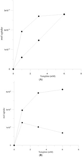 In Figure 4A, the result of template inclusion is expressed as moles of template hosted during film formation at the Pt-quartz crystal (calculated as: moles of cMIP—moles of cNIP for each monomer) as a function of the different concentrations in solution of the template. The formal mole values were determined by applying the Saurebrey equation (see Material and Methods) on the basis of the total measured frequency variation at the 12th sweep of deposition. The inclusion of Acetyl-HS was confirmed to be higher in poly-5-pOH-DP by at least one order of magnitude (about 10−9 moles hosted into the polymer) with respect to the uptake ability shown by poly-5-ph-DP (about 10−11/10−10 moles hosted), over the whole range of concentrations investigated. The same result was observed when Cbz-HS was used as the template. In fact, the uptake shown by poly-5-pOH-DP (Figure 4B) was approximately 10 times higher than that of poly-5-ph-DP. When Cbz-HS was 1 mM in solution it was hosted in a stoichiometric amount by poly-5-pOH-DP. Then the template hosted into the film decreased as its concentration in solution increased. The observed effect was considered to be a consequence of the detrimental effect of the bulky Cbz group on the polymerization []. This corroborated the higher inclusion observed for the acetyl-derivative, as its lower size was favorable for molecule proximity (a ratio monomer/template = 1.8 was estimated) with no interferences observed during film polymerization (at the adopted condition). The polymerization capacity of 5-ph-DP in the presence of both templates was observed but a trend to saturation was evident with Cbz-HS. In contrast, this plateau was not observed with Acetyl-HS (whose range of concentration was, however, limited by its solubility in AN/electrolyte).