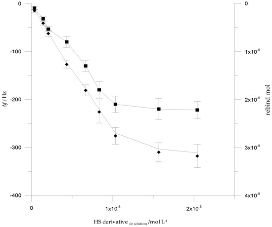 The increase of the Acetyl-HS binding sites inside the film was evaluated by changing the template concentration with respect to a constant concentration of monomer (1 × 10−3 mol·L−1). It was considered to be advantageous to not increase the film thickness. This would avoid deviation from the Sauerbery equation as a result of alteration of the damping of the frequency oscillation due to the variation of the viscoelastic properties of the film []. The formed film was about 100–130 nm thick and was considered rigid, as it was observed that higher film thicknesses were generally required to switch to “rubbery” behavior [,,]. Moreover, any inclusion has to be quantitatively reversible to avoid “memory effects” and to avoid the need to resort to cleaning that could eventually modify/destroy the structure of the cavity formed into the film [,] or delaminate the film from the quartz surface [].