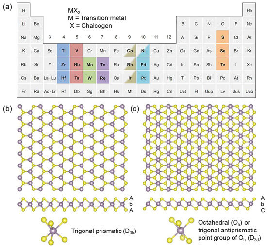 Bulk transition metal dichalcogenides, MX2, have layered structures of X-M-X, where M represents a layer of transition metal atoms, which is hexagonally packed and sandwiched between two X, which represent chalcogen atoms. In general, the thickness of each layer is about 6–7 Å [13]. About 40 different layered transition metal dichalcogenide compounds exist, as shown in Figure 1a [12]. The highlighted elements in the periodic table present the transition metals and the three chalcogen elements (S, Se and Te), which have a predominant tendency to crystallize in X-M-X layered structures. Co, Rh, Ir and Ni are partially highlighted, which present that only a portion of the dichalcogenides has layered structures. For instance, NiTe2 is reported to have a layered compound, while NiS2 shows a pyrite structure. The layers are connected by weak van der Waals forces as the M-X bonds within layers are typically covalent. This results in the easy splitting of the crystal along the layer boundaries. Four electrons donated from the metal fill the bonding state of a transition metal dichalcogenide. Therefore, the metal and sulfur atoms have +4 and −2 of the oxidation states, respectively. The lone pair electrons of the sulfur atoms are placed at the end of the layer surfaces, and the layers have been stable against the interaction between environmental species with the absence of dangling bonds. The metal of layered transition metal dichalcogenides can have the coordination either in the trigonal prismatic structure or the octahedral structure, determined by the arrangement of the metal and chalcogen elements (Figure 1b,c). Several polymorphs can be adopted to the transition metal dichalcogenides by the type of layer stacking orders. Trigonal, hexagonal and rhombohedral are the most common polymorphs, which can be represented by 1T, 2H and 3R, while the numbers represent the number of X-T-X units in the unit cell, in other words, the number of layers in the stacking sequence. Some transition metal dichalcogenides can be formed in several polymorphs and stacking sequences. For instance, the 2H phase is the most common polymorph of MoS2 in nature, as it is the most stable form, while the 3R phase is often adopted to the synthetic MoS2 to form a stacking sequence of AbA BaB and AbA CaC BcB, respectively, if we symbolize the chalcogen atom layers by capital letters and the metal atom layers by lower-case letters. TiS2 is largely formed in the 1T phase and the stacking sequence of AcB.