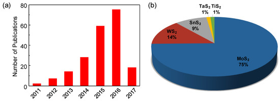 (a) Number of publications and (b) element forms of 2D transition metal disulfides used for gas sensor applications in the publications since 2011. The publication search was performed on 23 March 2017 using the Science Citation Index Expanded database of the Web of Science provided by Thomson Reuters. All possible keywords from combinations of gas sensor and 2D transition metal disulfides (MoS2, WS2, SnS2, TaS2, TiS2) were used for the search.