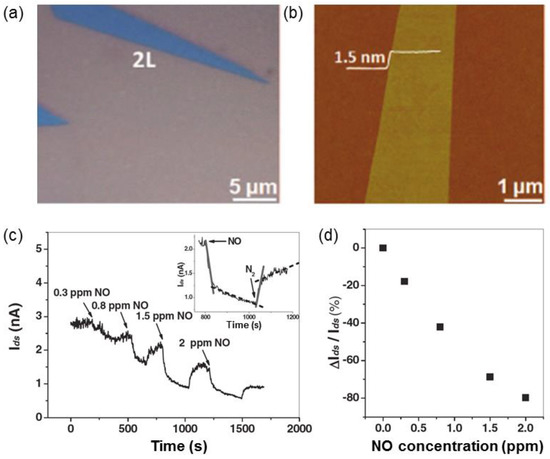 Li et al. demonstrated the gas sensing ability of FET based on a single- and multi-layer MoS2 films deposited onto 300 nm-thick SiO2 layer/Si substrates [20]. Single- and multi-layer MoS2 nanosheets are fabricated by the mechanical exfoliation technique (Figure 3a,b) [17,21,22]. The prepared MoS2 FET devices have an n-type semiconductor behavior. The current on/off ratio of bilayer (2L), trilayer (3L) and quadrilayer (4L) MoS2 devices is higher than 103 (Vg from −10–10 V), while the single-layer (1L) MoS2 FET has smaller values (≈ 102). The prepared single- and multi-layer MoS2 FETs are measured with NO gas at room temperature. The results show that the FET sensors fabricated with 2L, 3L and 4L MoS2 films have a pronounced sensitivity to NO and that the detection limit is 0.8 ppm (parts-per-million). By comparison, the monolayer MoS2 device exhibits a rapid, but unstable response. Figure 3c shows a typical current response of a 2L MoS2 FET device during the exposure to NO with a concentration range from 0.3 to 2 ppm. The p-doping effect contributes to the decrease of the current, which means the increase of the resistance during the exposure to NO [8,10,11,23]. It is similar to the charge transfer mechanism that occurs in the gas sensors based on 2D graphene [24] and 1D carbon nanotube [25]. The desorption and adsorption processes of NO can be split into two steps; one is a rapid and the other is a slow process. This phenomenon also can be found in the gas sensors based on graphene and explained by the different binding energies originating from each interaction between gas molecules and the different defect sites on the surface of the sensing materials [10].