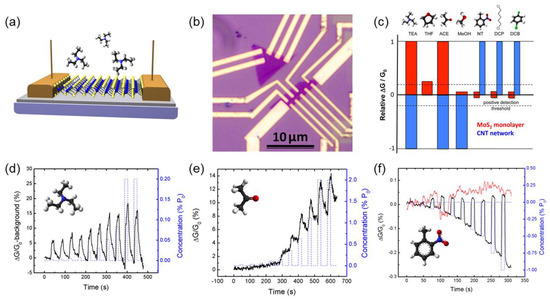 Perkins et al. reported that single monolayer MoS2 operates with high performance as a chemical sensor at room temperature, showing high selectivity to various analytes [26]. They produced sensors with planar structures composed with a monolayer MoS2 channel on SiO2/Si substrates, as shown in Figure 4a,b. The sensor with the MoS2 monolayer shows a distinct response to triethylamine (TEA-N(CH2CH3)3) exposure, which is a laboratory-safe decomposition product from the V series nerve gas agents. The degree of the conductivity variation rises as the TEA concentration increases. The response of the device to a sequence of pulses is shown in Figure 4d. Over the sequence of pulses, the TEA concentration increases from 0.002% P0 (1 ppm) to 0.2% P0 (100 ppm) in 450 s. The response of the device to a sequence of acetone (CH3)2CO pulses is shown in Figure 4e. The acetone concentration increases from 0.02% P0 (50 ppm) to 2% P0 (5000 ppm). The incremental trend of conductivity is highly correlated with the sequence of exposure pulses, while the amplitude of ΔG/G0 is on a par with a given concentration. Compare to the relatively high responses to the exposure of the TEA and the acetone, the MoS2 sensor shows almost no variation in conductivity to the exposure of analytes that are considered to be electron acceptors or weak donors. For instance, Figure 4f shows the response to a sequence of nitrotoluene (NT) pulses, a laboratory-safe simulant for the explosive trinitrotoluene (TNT). The MoS2 monolayer exhibits no variation in conductivity as the NT concentration increases from 0.01% P0–1% P0. For the sake of contrast, the response of the CNT network sensor is presented. The conductivity of the CNT increases significantly to the exposure. They hypothesized that the interaction mechanism between the analyte and the device is regulated by the localized lone pair orbitals of the sulfur end units. The Mo 3dyz orbitals and S 2p orbitals are placed on the surface plane as the charge density distributions make the Mo 3dyz slightly reduced (negatively charged) and the S 2p slightly oxidized (positively charged) [12]. Therefore, they can easily interact with the target analytes. They suspected that the SiO2 substrate under the MoS2 monolayer has its own positive charge; therefore, the negative charge of the Mo 3dyz orbitals can be compensated. As a result, the positively-charged S is only available for the interaction between the gas molecules and the surface. Hence, the MoS2 sheet has a significant interaction with donor-like analytes, corresponding to the experimental results.