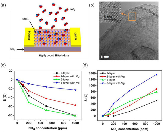 Late et al. reported the sensing performance of a MoS2 thin-layered structure transistor to the exposure of NO2 and NH3 in several conditions such as gate bias at room temperature [27]. As shown in Figure 5a, the electron-beam lithography is used for patterning Ti/Au electrodes on top of isolated MoS2 sheets, and the back gate geometry is also used for the fabrication of the gas-sensing devices. The single-layer MoS2 device shows unstable current variation over time as presented earlier [20], while multilayer MoS2 devices show better stable responses. They measured sensing behavior with and without applying back gate voltage (+15 V) for two-layer and five-layer MoS2 FETs when exposed to NH3 and NO2. Figure 5c,d shows the variation of the sensitivity as the concentration increases. The five-layer MoS2 sensor shows the highest sensitivity to the exposure of NO2 when operated with positive gate voltage. The highest sensitivity to the exposure of NH3 is shown on the five-layer MoS2 sample when operated without gate voltage. Their sensitivities to 1000 ppm NO2 and NH3 were determined to be 1372 and 86%, respectively. NO2 acts as an electron acceptor (p-type doping), while NH3 acts as an electron donor (n-type doping). Thus, for n-type semiconductors, such as MoS2, NO2 increases the resistance while NH3 decreases the resistance based on a charge transfer mechanism. As the NO2 is the electron acceptor, it has more electrons to accept when the electron accumulation occurred at the interface of MoS2 and SiO2 by applying the positive gate voltage. However, as NH3 is the electron donor, the electric field built up at the interface repels NH3 to donate an electron, which results in the decreases of the gas sensitivity.