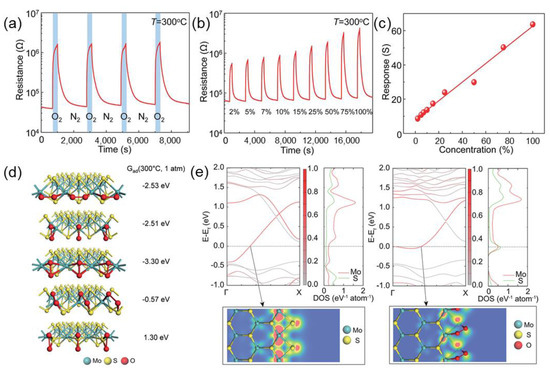Kim et al. investigated the oxygen sensing behavior of MoS2 chemoresistive gas sensors [28]. The sensors were prepared by liquid exfoliation methods from the MoS2 single crystal and dropcasting methods on Pt interdigitated electrodes (IDEs). Figure 6a shows the response of the liquid-exfoliated MoS2 sensor to four successive pulses of 100% O2 at 300 °C. The device exhibits pronounced stability and complete recovery to the four pulses of O2 without shifting the base resistance or responses. Figure 6b shows the measured responses of the sensor to the exposure of 2%–100% of O2 at 300 °C. The liquid-exfoliated MoS2 sensor shows responses of 8.69%, 10.83%, 12.25%, 13.73%, 17.4%, 23.98%, 29.96%, 50.28% and 63.73% to 2%, 5%, 7%, 10%, 15%, 25%, 50%, 75% and 100% O2, respectively. From Figure 6c, the slope of the plotted line shows the value of 5453.6 ppm−1, which indicates the sensitivity of the device. The first-principles calculations were used to investigate the critical role of the surface configurations of MoS2 particles prepared by using liquid-exfoliation techniques, which means the edge sites attract more O2 molecules than clean surfaces. They examined the electronic structure of the clean Mo-edges with S monomers both with and without O2 adsorption. Figure 6e shows the band structure (left) and the density of states projected on the edge atoms (right) for each model. The metallic character of the clean Mo–S bridges is indicated by the intersection of the energy band and the Fermi level in the band structure. The localized metallic states along the Mo-edges are indicated by the color intensity at the intersection of the energy band and the Fermi energy. The charge density distribution below the figure indicates that the metallic states result principally from the d orbitals of Mo atoms on the edges [29]. In other words, there are significant changes in the electronic structure with the adsorption of O2 molecules on the Mo–S bridge sites [30,31,32,33,34,35,36]. The metallic band is significantly flattened, which means that the effective electron mass is much higher than that for the clean edges. According to the semiclassical Drude model, the higher effective electron mass causes the decrease in the electrical conductivity. The localized electronic states along the Mo-edges are also demonstrated by the charge distribution at the bottom of Figure 6e.