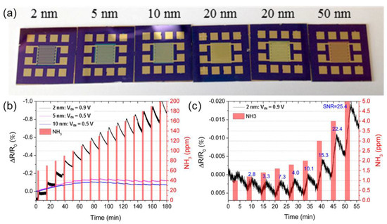 (a) Optical image of WS2 devices contacted with interdigitated electrodes. (b) Percentile resistance change versus time at given bias voltages for the 2-, 5- and 10-nm WS2 films with NH3 gas injections over 180 min. (c) Percentile resistance change versus time for the 2-nm film at a bias voltage of 0.9 V, upon interval NH3 exposures at various concentrations from 1 ppm–5 ppm (Reproduced with permission of [37]. Copyright Chemical Physics Letters, 2014.).