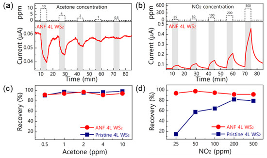 The improved gas-sensing properties of 2D WS2 nanosheets through Ag nanowires (NW) functionalization was demonstrated by Ko et al. [40]. WS2 nanosheets with a large area and Ag NWs were synthesized by the sulfurization process of atomic layer deposition (ALD) with WO3 and a modified CuCl2-mediated polyol process, respectively [41,42]. Ag NW-functionalized (ANF) WS2 was formed through spin-coating using the Ag NWs above. The gas sensors were fabricated with thermally evaporated metal contacts (Cr 5 nm, Au 50 nm). The gas sensing properties were measured at 100 °C. Figure 8a,b shows the gas-sensing property of the ANF WS2 gas sensor with a 4L WS2 nanosheet. After Ag NW functionalization, a current level of 4L WS2 gas sensor exhibits a result approximately two orders lower than that of the pristine WS2 gas sensor. ANF WS2 gas sensors consisting of 1L and 2L WS2 show similar results compared to those of the pristine WS2 sensor. This lowered current of ANF WS2 gas sensors is probably attributed to the n-type doping effect caused by the electrons transferred from Ag NWs to WS2 [43,44,45]. As shown in Figure 8c, the pristine and ANF 4L WS2 gas sensors show a high percent recovery greater than 90%, which implies good recovery to acetone sensing. On the other hand, as shown in Figure 8d, the pristine WS2 gas sensor exhibits relatively low percent recovery ranging from 15%–82% for NO2 exposure (25–500 ppm). However, the ANF 4L WS2 gas sensor shows significantly improved percent recovery for NO2 sensing (over 90%) because the low surface energy of Ag enhances the chemisorption of nitrogen and oxygen species on the Ag surface during the recovery process [46].