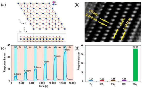 (a) Top and cross-sectional schematics of SnS2. (b) Zoomed-in HRTEM figure indicating that the interlayer spacing for hexagonal SnS2 is 0.587 nm. (c) Dynamic sensing performance of 2D SnS2 flakes toward NO2 gas at concentrations ranging from 0.6–10 ppm under the operation temperature of 120 °C. (d) Measured cross-talk of 2D SnS2 flakes toward H2 (1%), CH4 (10%), CO2 (10%), H2S (56 ppm) and NO2 (10 ppm) (Reproduced with permission of [52]. Copyright American Chemical Society, 2015.).