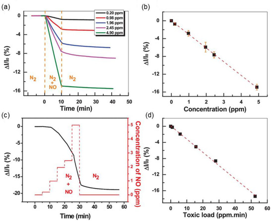 He et al. reported a dosage meter for toxic gas based on TaS2 nanosheets [53]. The TaS2 thin film is prepared via the vacuum filtration of TaS2 aqueous suspension obtained from the electrochemical lithium-intercalation method [54,55,56]. The fabrication of a planar chemoresistive sensor was processed by placing the TaS2 strip (rectangular shaped) onto Si/SiO2 (300 nm) substrate. Then, the deposition of silver paint on both ends of the rectangularly-shaped strip was done for the use of drain and source electrodes. The TaS2 gas sensing performance was evaluated by the conditions of bias of 0.4 V at room temperature, exposing to NO gas with controlling the concentration. The device performed a current response of the NO exposure irreversibly. Furthermore, there was no current recovery at all, even after a long time purge with N2 or heating the sample. At very low concentrations, the sensor based on TaS2 film showed a linear current response and responded immediately towards the change of concentration. Due to these properties, detecting the total dosage of NO under fluctuating concentration is possible. Figure 10a shows the current responses of TaS2 devices against NO exposure at different concentrations for 10 min. The current response and the NO concentration have a quasi-linear relation at ppm level, as shown in Figure 10b. Due to this linear current profile, the TaS2 sensor can realize the integration of the total dosage of NO at fluctuating concentration. The current responses of a typical TaS2 device upon continuous exposure of NO at five different concentrations were tested (Figure 10c). The rate of current decrease (or the sensitivity of the device) increased with the escalation of NO concentration from 0.19 ppm to 4.9 ppm. The linear relation between the current response and the total toxic load for the TaS2 device was demonstrated. (Figure 10d). Thus, the TaS2-based device meets the requirements for a dosage meter. From the current profile, total toxic load can be directly read out. Since the current response upon NO exposure is irreversible, it is available to record the toxic load of NO gas continuously in the sub-ppm level.