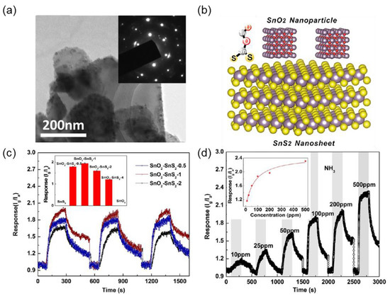 Xu et al. have revealed the roles of the heterogeneous interface in the gas sensing properties of SnO2-SnS2 hybrids to ammonia at room temperature [57]. SnS2-SnO2 hybrids are synthesized by oxidizing pristine SnS2 in air at 300 °C with different times from 0.5–4 h (Figure 11a,b). To form a suspension of SnS2 nanosheets, they were dispersed uniformly in ethanol by ultrasonication for 15 min. The suspension was dropcast onto the Au interdigitated electrodes. The sensors were named as SnO2-SnS2-X, where X indicates the different oxidation time in hours. The inset of Figure 11c shows the responses of the sensors, which are measured by the Ig/Ia (represent the current in NH3 and dry air) values. The response of the sensors initially increases and then decreases from SnO2-SnS2-0.5 to SnO2-SnS2-4. The maximum is for SnO2-SnS2-1. The evolution of chemical bonds has the same change trend, which indicates that the performance of the gas-sensing is highly dependent on the number of chemical bonds at the interface. SnO2-SnS2-0.5, SnO2-SnS2-1 and SnO2-SnS2-2 also show good reproducibility and quick response. The typical response recovery characteristics of SnO2-SnS2-0.5, SnO2-SnS2-1 and SnO2-SnS2-2 to 100 ppm of NH3, which appear moderately reproducible, are shown in Figure 11c. Figure 11d indicates the response and recovery characteristics of SnO2-SnS2-1 to NH3 with concentrations of 10, 25, 50, 100, 200 and 500 ppm at room temperature. The sensitivity and reproducibility characteristics of the sensor both show high performance when exposed to various NH3 concentrations. The response is about 1.16 to the exposure of 10 ppm NH3, which indicates that a low detecting limit can be achieved by using SnO2-SnS2 hybrids as the gas sensing material. The comparison of the series of SnO2-SnS2 hybrids oxidized for the time range of 0.5–4 h verifies the dependence between the response of SnO2-SnS2 hybrids to NH3 at room temperature and the interface positioned chemical bonds.