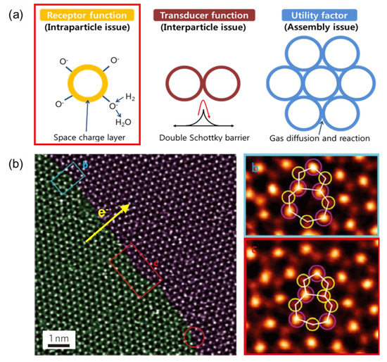 (a) Three basic factors controlling semiconductor gas sensors. (b) STEM- annular dark-field (ADF) image of a MoS2 grain boundary with its common dislocations highlighted and close-ups of the regions highlighted (Reproduced with permission of [69]. Copyright Nature Publishing Group, 2013.).