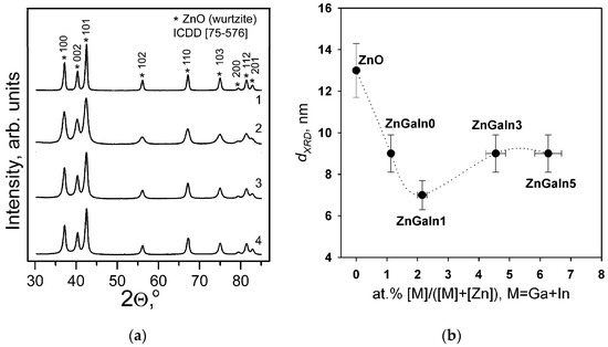 Figure 1. (a) XRD patterns of Zn(Ga, In) powders: (1) ZnGaIn0, (2) ZnGaIn1, (3) ZnGaIn3, (4) ZnGaIn5; (b) The dependence of ZnO grain size dXRD calculated from the broadening of the (002) XRD peak on donor impurity content.