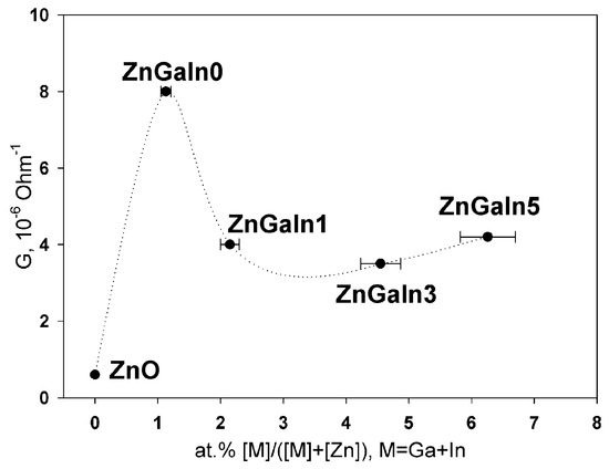 The dependence of ZnO(Ga, In) thick films conductance on impurity content is presented in Figure 2. The single doping with gallium (1.2 at.%) leads to the growth of ZnO conductance. Both Ga and In act as donor impurities in zinc oxide if occupy Zn cation sites in the ZnO lattice according to the quasi-chemical reaction (Kröger–Vink notation of point defects is used) [1]