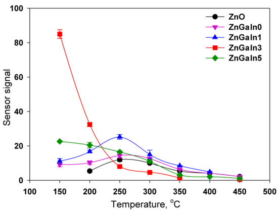 The temperature dependences of the sensor signal for all samples have a maximum. The increase in the sensor signal with decreasing temperature is due to the displacement of the adsorption–desorption equilibrium of nitrogen dioxide towards adsorption. The decrease in the signal with a further decrease in the measurement temperature is because of kinetic difficulties in the relaxation of the resistance to the initial value in the absence of NO2. For ZnO and ZnGaIn0 samples the maximum sensor signal was observed in the temperature interval 250–300 °C (Figure 4). The introduction of a minimum amount of indium (1.12 at.%) leads to the increase of sensor signal to NO2 while the form of the temperature dependence remains the same. An increase in the concentration of indium to 3.5 at.% is accompanied by the principal change in the form of the temperature dependence of the sensor signal: the maximum of the signal is shifted vs. lower temperatures, the signal value at T = 150 °C increases significantly. A further increase in the In concentration up to 5.3 at.% results in a decrease in the signal value at T = 150 °C, but the form of the temperature dependence as a whole does not change. Lowering the measurement temperature (<150 °C) leads to an increase in the resistance of the samples in the presence of NO2 up to 1.5 × 109 Ohm, which is the limit of the measuring system. This made it impossible to unequivocally determine the temperature corresponding to the maximum sensor signal for ZnGaIn3 and ZnGaIn5 samples.