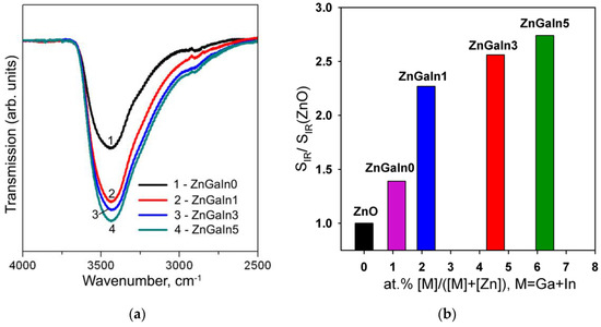 Figure 5. (a) IR spectra of investigated samples in the spectral region 2500–4000 cm−1: (1) ZnGaIn0, (2) ZnGaIn1, (3) ZnGaIn3, (4) ZnGaIn5; (b) The dependence of the concentration of surface hydroxyl groups, represented as a peak area corresponding to OH stretching vibrations (SIR) normalized to the corresponding value for bare ZnO (SIR(ZnO)), on impurity content.
