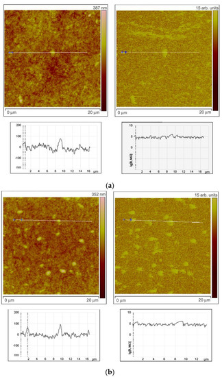 While the tip scans the sample in contact mode and captures data regarding the topography (left part of the figures), a current-measuring scheme senses the current passing through the sample allowing to obtain electrical information while simultaneously acquiring conventional topographical AFM data. The resulting current (I) is a measure for resistance (R) through the basic R = V/I relation (V, potential difference). The total resistance between the tip and the sample consists of a number of terms: the resistance of the small contact formed by the tip and sample (i.e., the contact resistance); the spreading resistance, which is related to the fact that the current has to spread out from the small contact into the bulk of the sample; and the resistance of the bulk material. The silicon SPM tip coated by Pt/Ir alloy was used to improve the contact. The ohmic nature of the contact was tested by the R(V) dependence measurements. To estimate the spreading resistance for the tested samples, the formula for an ideal ohmic, circular contact was used: R = ρ/4r, where r is the contact radius (25 nm for the used SPM tip), and ρ is the local sample resistivity. By measuring the resistance, one has access to the local sample conductivity (reverse resistivity).