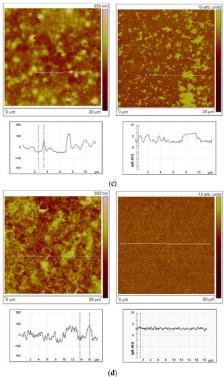 Comparing surface topography and the SSRM images at Figure 6a,b, one can note that, at low In concentrations (0.74 at.%), the grains with high resistance can be observed on the surface as well as the lower resistance areas between the grains. The same brighter grains can be seen at the left and right images in this case and the cross-sections show that the resistance is growing more than 10 times on each mentioned grain. When In concentration was increased to 3.4 at.% the heterogeneity of the resistance surface distribution has increased (Figure 6c). Surface regions with high resistivity are observed in the images not repeating the grains distribution. At the same time, grains with high and low resistivity are also observed in this case. This situation corresponds to the highest sensor signal to NO2 at low measurement temperature of 150 °C. Figure 6d reveals the fact that the resistance of the surface becomes way more uniformly distributed at In an concentration of 5.9 at.%. The SSRM image is absolutely not repeating the surface topography in this case.