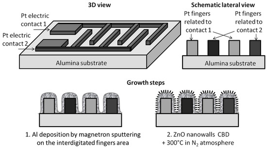 First, we attempted to grow the ZnO NWLs on the bare alumina substrate, but this approach failed, confirming that for their formation they need of a thin layer of metallic aluminum, acting as a catalytic layer [8]. Thereby, an Al layer of about 20 nm was deposited by sputtering onto the Pt interdigitated fingers area of the electrodes (but covering the Pt electric contacts). It is noteworthy that such a thin layer is partially oxidized during the CBD, so it will not act as a short circuit between electrodes. During the CBD, the substrate was held vertically (for 1 h @ 90 °C) in the chemical bath (Zinc nitrate + hexamethylenetetramine) solution. After the ZnO NWLs deposition, the substrate was dried and annealed in inert atmosphere for 1 h at the temperature of 300 °C.