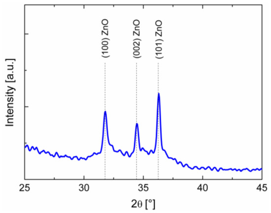 X-ray diffraction analysis of the annealed ZnO NWLs sensing layer is reported in Figure 3. The diffraction pattern confirms the presence of ZnO crystal structure with the typical reflection peaks of ZnO (100, 002, 101). The crystallite dimension was estimated by the X-ray reflection peak broadening method via the Scherrer equation. The crystallite size, calculated assuming a Gaussian-type distribution for each individual peak, varies from 29.3 to 38.6 nm over the diffraction angle range 31.78°–36.27°, with an average value of 34 nm.