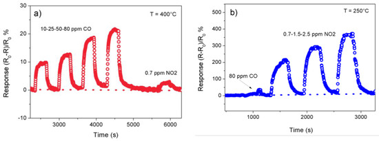 The above results indicated that the sensor performance is highly dependent on the operating temperature. Interestingly, when properly choosing the operating temperature, the sensor demonstrated the opposite response to CO and NO2, respectively. The ability to distinguish between NO2 and CO when employing low and high operation temperatures is due to the well-known bell-shaped response curves of metal oxide gas sensors [21] and the commonly lower detection temperatures for the case of NO2. Therefore, we tested the sensor at two different temperatures, chosen for maximizing the sensitivity and selectivity toward CO and NO2. The dynamics of the responses obtained are shown in Figure 5. At the temperature of 400 °C, the sensor responded selectively to CO, being almost insensitive to the low concentration of NO2 (Figure 5a). At the lower temperature of 250 °C, the sensor was instead very sensitive and selective to NO2 (Figure 5b).