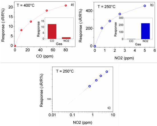 The calibration curves, related to the above experiments, are reported in Figure 6a,b. It is clearly observed that, at higher temperature, the sensor responds selectively to CO, whereas at a lower temperature the sensor is instead very sensitive and selective to NO2 (see insets in Figure 6a,b).