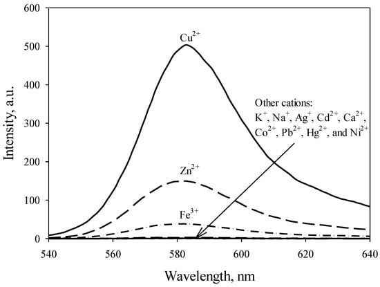To date, various Cu2+-rhodamine-based chemosensors were developed which involved some negligible interferences of competitive cations [24,25,26,27]. On the periodic table of elements, the three transition cations Cu2+, Zn2+ and Ni2+ lie in the same period and are next to each other [26]. The differentiation of their photophysical properties is too difficult, due to their similar coordinating ability and the high proximity of their values of ionic radius and charge density [28]. As shown in Figure 2 and Figure 3, among various competitive cations, only Zn2+ and Fe3+ displayed 86 and 21-fold enhancements, respectively, in fluorescence intensity at the same concentration. Importantly, the fluorescent signal of RECM to Cu2+ hardly can be interfered by the other cations with similar concentration. A number of recent studies revealed similar results to this study, owing to reporting Cu2+ chemosensors composed of one or more carbonyl O atoms and amine N atoms in the hydrazide moiety of a spirolactam-based rhodamine derivative [12,14,29]. Thus, it is self-evident that oxygen and nitrogen donor atoms could be introduced into the structure of a Cu2+ chemosensor in order to eliminate interference caused by intervening competitors such as Fe2+, Fe3+, Ni2+, and Zn2+. The presented results of this work demonstrated that only Cu2+ could give a high fluorescence intensity and strong absorbance together with no considerable fluorophore-cation interaction of other mentioned cations, and RECM offered an excellent selectivity toward Cu2+.