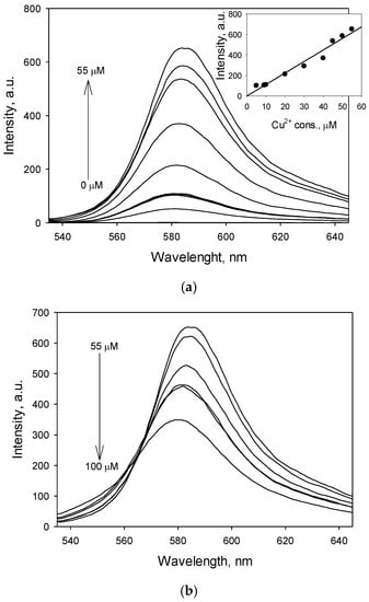 The fluorescence and absorbance decreased upon addition of more than 55 µM and 45 µM Cu2+ respectively, that might be respected to the paramagnetic nature of Cu2+ [27,36,37]. Paramagnetic square-planar or tetragonally distorted metal ions such as Co2+, Cr3+, Cu2+, Fe3+, Ni2+, and Pd2+ are able to quench the fluorescence of optical chemosensors which is presumptively undesirable for analytical purposes [38]. The paramagnetic effect is basically the result of an enhanced electronic states’ mixing (considered as a formally forbidden intersystem crossing) of a ligand by means of the inhomogeneous magnetic field of the paramagnetic ion [39]. For this reason, classical probes for Cu2+ and other strongly paramagnetic metal ions are usually based on the quenching of the fluorescence [40]. Shao’s group [41] designed a highly selective Cu2+ fluorescent sensor has based on a spiropyran derivative, which combines the characteristics of metal binding and signal transduction in cationic recognition. Their study revealed that lower concentrations of the chemosensor in the system resulted in the weak blank fluorescence signal value, while at relatively higher concentrations of the chemosensor, the fluorescent response could not be quenched completely even if a high concentration of Cu2+ was added to the solution. In our study, RECM and Cu2+ binding did open the spirolactam ring. Nevertheless, the fluorescence of the ring-opened amide forming upon increasing Cu2+ concentrations was partially quenched by the cation [24]. A possible answer would be a relative lack of sufficient concentration of the fluorescent sensor to cause the recognition process to be assured of avoiding the paramagnetic effect. From a signal detection viewpoint, the quenching behavior of the probe, however, is not a preferable fluorescence enhancement response [5,24].