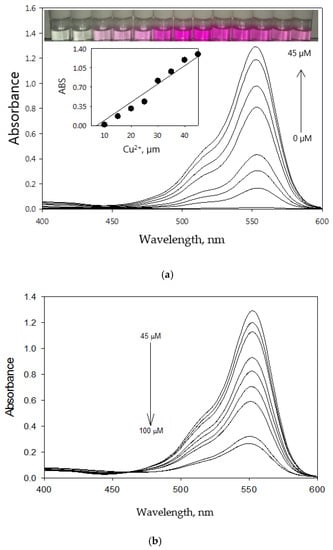 The absorbance titration of RECM (50 µM in CH3CN) was conducted with a Cu2+ concentration range of 9–100 µM in CH3CN. The absorbance spectra exhibit significant enhancement upon addition of increasing concentrations of Cu2+ up to 45 µM (Figure 5a), which is confirmative suggesting the delocalization xanthene moiety and spirolactam formation of RECM. In addition, the absorbance response increases linearly within the range of 1–45 µM (R2 = 0.958) (Figure 5a, inset). Visual color changes of RECM in the presence of Cu2+ are also shown in Figure 5a (inset). In contrast, absorbance decreases upon addition of more than 45 µM (Figure 5b).