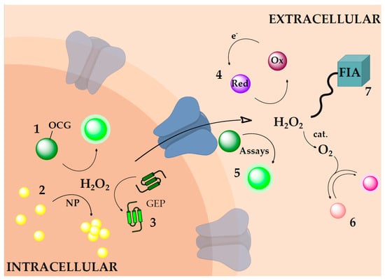 | Assays | Well established for biological fluids, Allows monitoring of H2O2 dynamics over time. | Irreversible, Cross-sensitivities (e.g., NADH, reduced glutathione, ROS, pH, phenols…), Low temporal-resolution, Samples need to be taken prior to measurement. |
