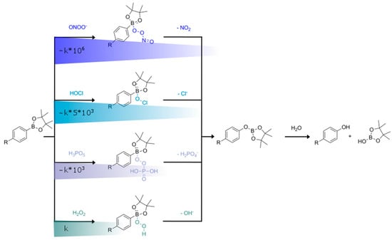 - Sikora, A.; Zielonka, J.; Lopez, M.; Joseph, J.; Kalyanaraman, B. Direct oxidation of boronates by peroxynitrite: Mechanism and implications in fluorescence imaging of peroxynitrite. Free Radic. Biol. Med. 2009, 47, 1401–1407. [Google Scholar] [CrossRef] [PubMed]
