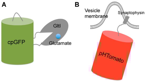During the neurotransmitter-containing vesicles fusion to the presynaptic membrane upon AP propagation, the lumen of the vesicle, which is normally maintained at an acidic pH ~ 5.6, is exposed to the extracellular space (pH ~ 7.4). Subsequent vesicle recycling resets the acidity of the vesicle pH [194,195]. Thus, tracking the vesicle pH changes associated with vesicle exocytosis and recycling events represent a plausible way to report on synaptic transmission. pH-sensitive variants of GFP are well suited to such applications. The first genetically encoded pH indicator tailored for this application is SynaptopHluorin, in which a pH sensitive GFP (pHluorin) was fused to the C-terminus of synaptobrevin/VAMP2 (vesicular associated membrane protein-2) [168]. The indicator was successfully localized to the inner surface of synaptic vesicles and faithfully reported local pH changes associated with transmissions at individual synaptic boutons. To explore the in vivo application of synaptopHluorin as a neurotransmitter indicator, Ng et al. targeted the probe to all three classes of neurons in the antennal lobe of Drosophila and performed functional imaging of olfactory circuits in response to natural odors [196]; Bozza et al. expressed the probe in mice mature olfactory sensory neurons, allowing them to monitor odorant-evoked activation of the sensory neurons in glomeruli of the olfactory bulb, and to reveal the spatial patterns of odorant-activated glomeruli [197]. Alternative targeting domains, such as synaptophysin [186] and vesicular glutamate transporter (vGlt1) [187], were used to better target pHluorin to the synaptic vesicle. Red-shifted variants of synaptopHluorin, including VGLUT1-mOrange2 [188] and sypHTomato (Figure 4B) [189], were also developed by switching pHluorin to pH-sensitive, red-shifted FP mutants. These color variants are spectrally compatible with GCaMP and permit concurrent measurements of calcium dynamics and synaptic vesicle recycling [188,189].