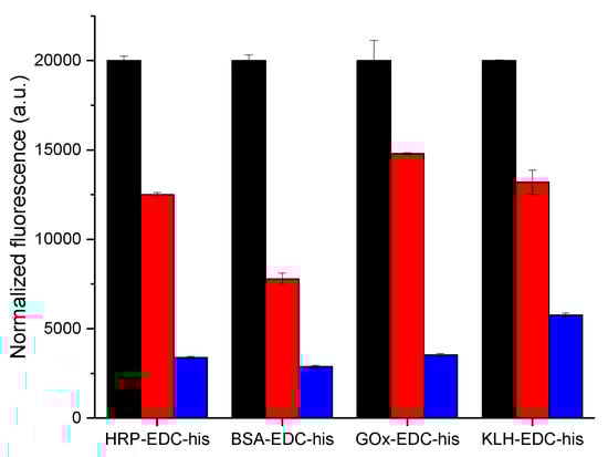 However, Ab1 did not bind to the respective free proteins while Ab2 bound them to high extent. Ab1 bound the respective protein-EDC-his conjugate more efficiently than the pure carrier protein: for KLH, 4%; for GOx, 7%; for HRP, 9%; and for BSA, 20% binding compared to corresponding protein-EDC-his conjugate were observed (Figure S2). The Ab2 bound the pure proteins up to 53–78% (in case of BSA, GOx or KLH) and 29% in the case of HRP, respectively.