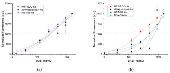 Normalized fluorescence response in simulated assay upon addition of increasing amounts of Ab1 onto the selected probes: (a) HRP-EDC-his, commercial BSA-his and HRP(kit)-his; and (b) HRP-EDC-his, GOx(oxidized)-his, HRP-GA-his, and BSA-GA-his. The signal level of 10,000 is indicated with a dashed line.