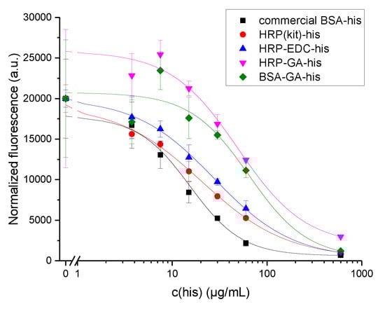 A binding inhibition assay for histamine was established using Ab1. Histamine-conjugates prepared with carbodiimide chemistry (BSA/HRP/KLH/GOx-EDC-his), HRP (kit)-his, GOx(oxidized)-his, BSA/HRP-GA-conjugates and commercial BSA-his conjugate were used as probes spotted onto ARChip Epoxy. The antibody concentration was titrated in the simulated assay (Figure 3) and based on that two concentrations were selected for the binding inhibition assay: 900 ng/mL and 250 ng/mL. With the lower antibody concentration, the signals were naturally lower, but could be easily adjusted by changing the measurement parameters of the fluorescence scanner (increasing the voltage of the photomultiplier tube (PMT)). Despite different signal levels the change in antibody concentration had only a little effect on the assay performance in terms of the IC50 or dynamic range. For instance, in the case of HRP(kit)-his with 250 ng/mL of Ab1 the dynamic range was 35 µg/mL narrower and the IC50 was lower by 13 µg/mL. The relatively small differences might be because the “dynamic range” in the simulated assay was relatively narrow. Likewise, the choice of the carrier protein in EDC-conjugates did not have any effect on the binding. The normalized response to these probes was the same regardless the carrier protein, thus the HRP-EDC-his is shown. The standard curves are shown in Figure 4. The dynamic range was similar with all the probes prepared with carbodiimide chemistry. With commercial BSA-his conjugate the dynamic range was narrower (4–38 µg/mL), as well as with HRP(kit)-his (4–89 µg/mL) (Table 2). Using IC50 as an index for assay sensitivity, the most sensitive detection was achieved with commercial BSA-his (14 µg/mL), however the sensitivity with HRP(kit)-his (20 µg/mL) and HRP-EDC-his (28 µg/mL) were in similar level. When using glutaraldehyde-conjugates sensitivity was lost: with BSA-GA-his the IC50 was 70 µg/mL and HRP-GA-his 85 µg/mL, respectively. Nonetheless, the dynamic range was wider using glutaraldehyde-coupled conjugates compared to protein-EDC-his probes; from 37 µg/mL up to 336 µg/mL with HRP-GA-his. Protein-EDC-his probes showed the highest signals in zero analyte concentration. The signals of the commercial BSA-his conjugate varied significantly compared to the other probes, up to 40% between the independent experiments, nevertheless the maximal signal reached levels of 93% of the HRP-EDC-his signal. The other probes exhibited lower signals. Compared to the signal of HRP-EDC-his probe their signal levels were, for each probe: HRP(kit)-his, 72%; KLH-succ-EDC-his, 21%’ BSA-GA-his, 19%’ GOx(oxidized)-his, 5%; and HRP-GA-his, 4%. Even though the absolute signal levels varied within the probes, the differences could be simply compensated by adjusting the measurement settings, i.e., the voltage of the photomultiplier tube. However, the most challenging aspect of the conjugates was their stability and their performance in the assays regarding the repeatability. GOx(oxidized)-his broke down within two weeks, and the glutaraldehyde conjugation chemistry resulted in high variation within the assay in addition to the lower sensitivity compared to the other probes. Furthermore, the commercial BSA-his and HRP(kit) required freshly spotted slides to be used. In terms of stability the protein-EDC-his conjugates showed the highest stability and the probes spotted onto slides were reproducibly usable even after five months of storage.