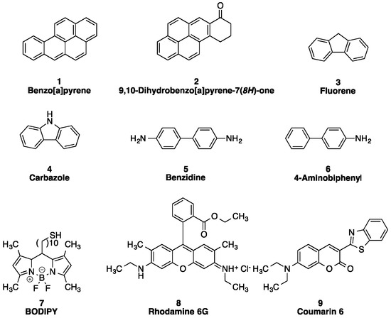 Analytes selected include highly toxic polycyclic aromatic hydrocarbons (1–3), Analyte 4 was chosen as a structurally similar derivative of analyte 3. Analyte 5 is a toxic and carcinogenic compound commonly used in the textile industry. Analyte 6 was chosen as a structurally similar derivative of analyte 5. Overall, this varied analyte selection ensures that the resultant chemosensors are able to detect a variety of structural features, chemical variations, and analyte characteristics, highlighting the broad applicability of the reported results.