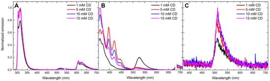 A comparison of the fluorescence emission obtained using 1 mM (black line), 5 mM (red line), 10 mM (blue line) and 15 mM (purple line) γ-cyclodextrin for (A) analyte 3; (B) analyte 4; and (C) analyte 5 with fluorophore 7.
