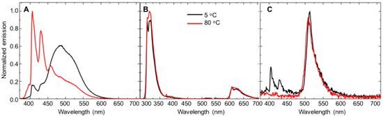 Moreover, Figure 3A indicates a substantial change in the benzo[a]pyrene fluorescence emission on going from 5 °C to 80 °C, with higher excimer emission observed at the lower temperature. This is in line with literature reports that indicate higher excimer amounts at low temperatures [44,45,46], and is likely due to increased solution viscosity resulting in decreased molecular motion, as well as an increase in the favorability of excimer formation. In contrast, analytes 3 and 5, with no reported excimer formation, show a slight decrease in the fluorescence emission of fluorophore 7 at 80 °C compared to the emission at 5 °C, but the spectral fine structure is largely maintained. Additional temperatures between 5 °C and 80 °C were also tested (see ESI for more details); however, no clear trend existed with slight temperature variations.