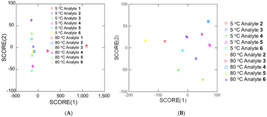 Results from statistical arrays generated using analytes 1–6 with fluorophores 7–9 in Figure 4A show an interesting linear grouping of analytes. The observed grouping of analytes is likely due to the large difference in response signals for analyte 1 at both 5 °C and 80 °C as compared to analytes 2–6 at the same temperatures. When the anomalous analyte 1 is removed from the statistical array, a greater visual separation of analytes arises (Figure 4B). These results show well-separated response signals for structurally similar analytes (analytes 3 and 4 or analytes 5 and 6) as well as single analytes at different temperatures (5 °C analyte 2 and 80 °C analyte 2). These results indicate differences in response signals arising from the different temperature cyclodextrin-analyte-fluorophore combinations, which highlights the practical applicability of these chemosensors to be used for detection in a wide range of temperatures.