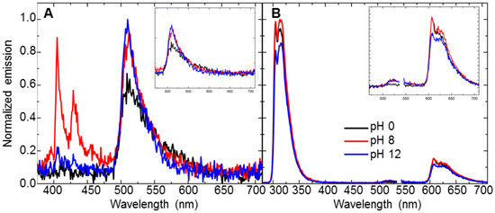 A comparison of the fluorescence emission in γ-cyclodextrin at pH 0 (black line) and pH 8 (red line), and pH 12 (blue line) with (A) analyte 5; and (B) analyte 6 with fluorophore 7. Insets show the zoomed-in spectral region from 470–800 nm.