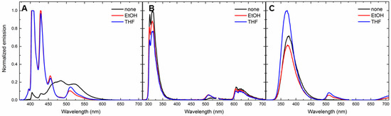 A comparison of the fluorescence emission in γ-cyclodextrin in the absence (black line) and presence of ethanol (red line) and THF (blue line) with (A) analyte 1; (B) analyte 3; and (C) analyte 6 with compound 7.