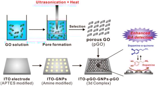 A 3D porous graphene oxide with gold nanoparticle composites was developed by Choo et al. for dopamine detection [36]. Figure 5 shows the fabrication approach of the sensor. Porous graphene oxide was prepared using an ultrasonic probe, and then gold nanoparticles were incorporated. The 3D complex exhibited excellent sensitivity for dopamine detection using CV measurement and the detection limit of the sensor was 1.28 μM with linear response in the range from 0.1 μM to 30 μM. Also, the selectivity of the sensor is further verified using amperometry. The current change of 8 nA was obtained after adding 10 μM of dopamine, while no significant signal change was observed after adding the same concentrations of glucose and ascorbic acid. No significant signal was obtained when the sensor was tested with glucose and ascorbic acid.