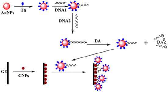 An aptamer-based dopamine sensor has been successfully demonstrated by several groups [79,80,81,82,83,84,85]. In Xu’s work, they first modified the carbon nanoparticles on gold electrode, then immobilized thionine on the surface of gold nanoparticles [80]. Afterwards, they immobilized DNAs on the nanoparticles forming an electrochemical probe. Dopamine-binding aptamers were then added into the probe solution, which hybridized with the previously immobilized DNAs (see Figure 7). When DA is exposed to the AuNPs, the electrochemical probes (AuNP-thionine-DNA1 complex) will be released providing an electrical current as a transduction signal. DPV was used for DA detection, showing clear response with a detection limit of 1.0 × 10−8 M.