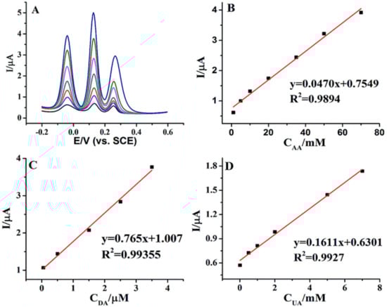 Simultaneous detection of DA, UA, and AA by Sun et al. (A) The DPV responses when exposed to AA, DA, and UA, simultaneously, and the calibration curves for (B) AA, (C) DA, and (D) UA. Reprinted with permission from [124].