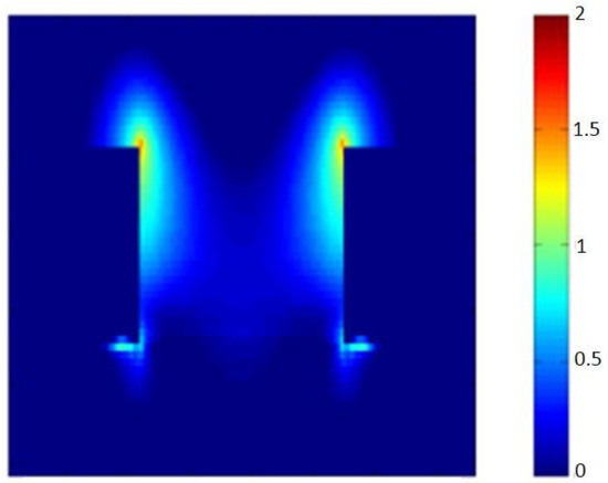 Electric field in the gap between two gold cylindrical nanoparticles for an incident plane wave of wavelength 650 nm. The nanoparticles are in a two-dimensional hexagonal array and have a diameter of 170 nm, height 50 nm, and center-to-center separation of 300 nm. The electric field magnitude is normalized to the magnitude of the incident field. Note the scale is logarithmic from 0 (dark blue) to 2 (dark red).