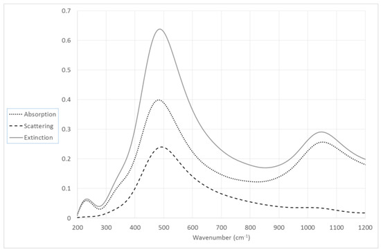 Using these parameters we have investigated the spectral response of a rectangular prism-doped germanium (n-Ge) particles sitting on an un-doped Ge substrate, as depicted in Figure 2. Figure 3 shows the absorption, scattering and extinction for a particle that is 2-μm long, 1-μm wide and 1-μm high. It can be seen that there are two extinction peaks, one at 490 cm−1 (wavelength of 20.4 μm) and the other at 1050 cm−1 (9.523 μm).