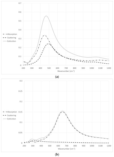 Spectral response for rectangular doped Ge particles (material 2 in Table 2) for (a) height 0.5 μm and (b) height 0.1 μm. The length is 2 μm and the width is 1 μm in both cases.