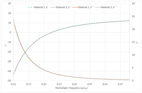 The real and imaginary parts of the dielectric constant derived from the two materials considered in Table 2 are shown in Figure 8, where the frequency (x-axis) is normalized to ωp for both samples. It is interesting to note that the real and imaginary parts for both materials overlay each other when normalized. Hence, the results shown in Figure 3, Figure 4, Figure 5 and Figure 6 could also be normalized (or scaled in dimensions) to the plasma frequency, which is proportional to the free carrier concentration.