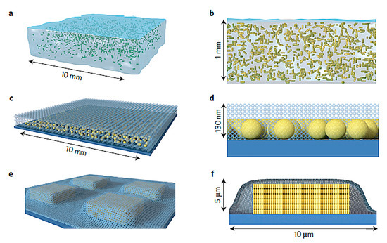 Schematic representation of nanostructured porous substrates for in situ plasmonic detection and imaging of QS in Pseudomonas aeruginosa biofilms. (a,b) Au@pNIPAM hydrogel with embedded Au nanorods (drawn in green). (c,d) Mesostructured Au@TiO2 substrate with a mesoporous TiO2 thin film over a submonolayer of Au nanospheres. (e,f) Micropatterned Au@SiO2 supercrystal array comprising Au nanorods organized in micrometer-sized pedestal-like structures coated with mesoporous silica. Panels (b,d,f) represent cross-sectional views. Reproduced with permission from Nature [65]. Copyright (2016) Nature Materials.