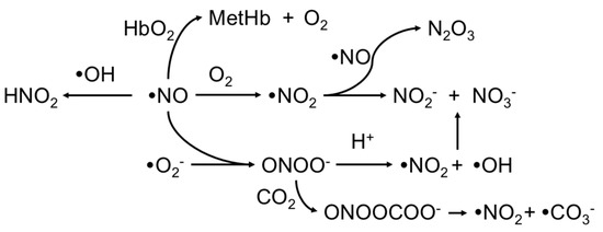 Nitric oxide (NO) has a very high reaction rate. Some of the pathways in the development and degradation of NO are shown [50,55,56,57].