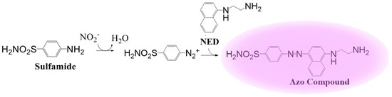 Because of NO’s high reactivity rate, examining upstream or downstream indicators of NO is a popular method to estimate NO concentration within samples. The Griess assay (Promega, Madison, WI, USA) determines nitrite concentration, since it is a stable byproduct of NO, and can be utilized to calculate the concentration of NO that was present in a sample before degradation occurred. The Griess test was originally published by Peter Griess in 1879 and many alterations have been made to create the current commercially available assay, although it still relies upon the diazotization reaction that Griess originally described [58]. The Griess test is relatively simple, requiring the addition of sulfanilamide in phosphoric acid and then N-1-napthylethylenediamine dihydrochloride to the samples of interest, as depicted in Figure 2 [59]. The solution will change color due to the azo compound and absorbance measurements can be compared to a standard to determine the concentration of nitrite in the samples.